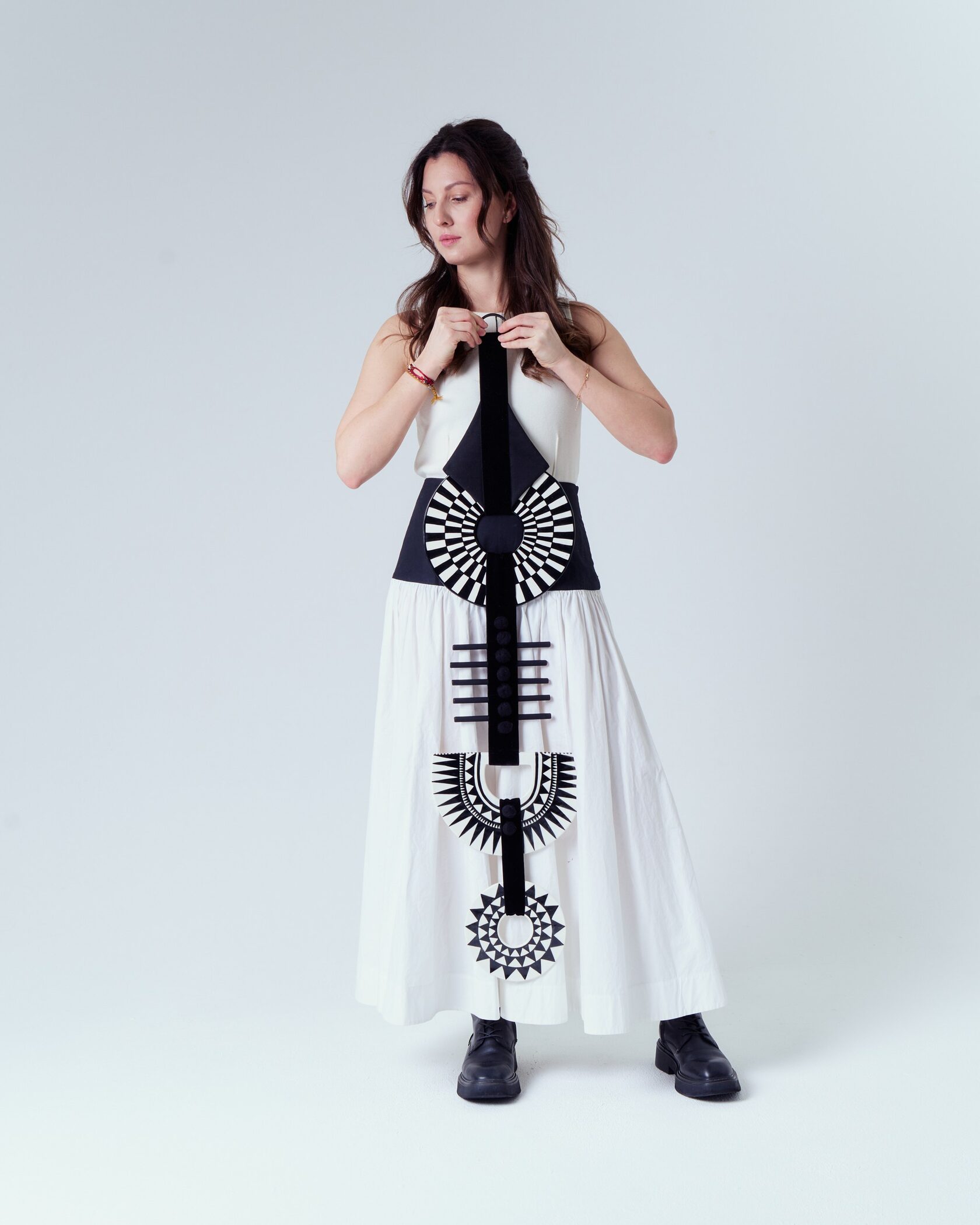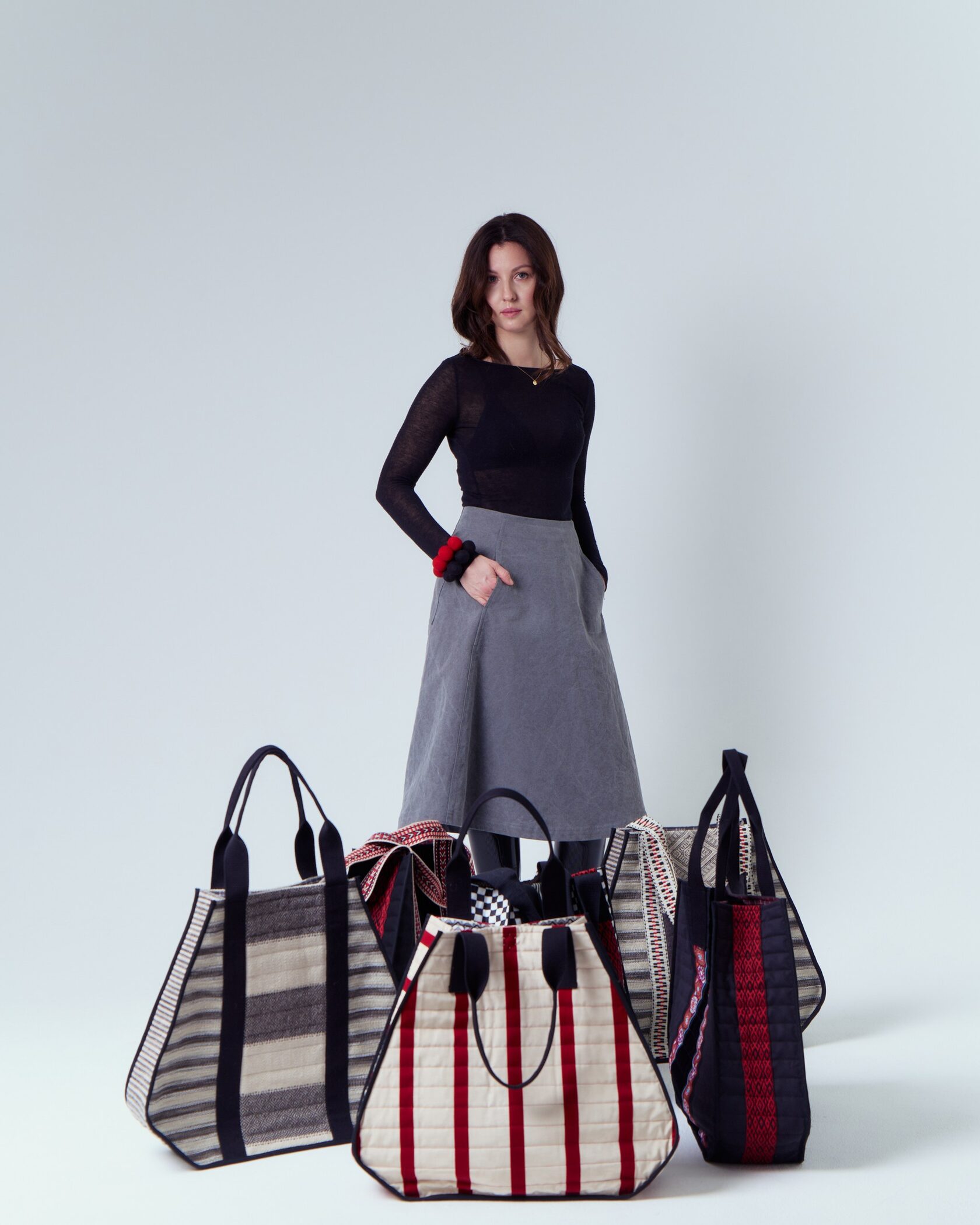 Мы используем базовые качественные европейские ткани, экзотические ткани, которые привозим из бесконечных путешествий, винтажные отрезы, интерьерные ткани, а также ткани с нашим дизайном, добавляя тесьму и отделку. И керамика нам в помощь в удивительных брошках и украшениях.